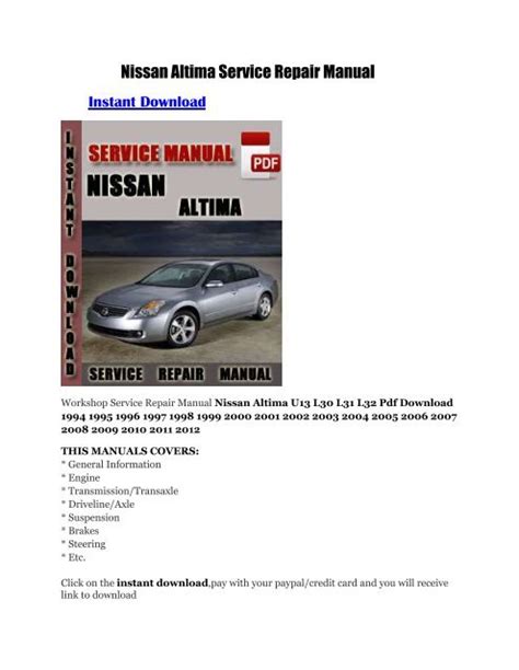 Currently you are looking with regard to an 2012 Altima L32 D32 Service And Repair Manual example that we provide here within some kind of document formats many of these as PDF, Doc, Energy Point, as well as images that will make it easier for you to create an 2012 Altima L32 D32 Service And Repair Manual yourself. For a more clear look, you may open a few examples below. All the good examples about 2012 Altima L32 D32 Service And Repair Manual about this site, we get from several sources so you may create a better file of your own.If the search you obtain here does not match up what you are searching for, please utilize the research feature that we possess provided here. You are usually free to download something that we provide in this article, expense cost you the slightest.